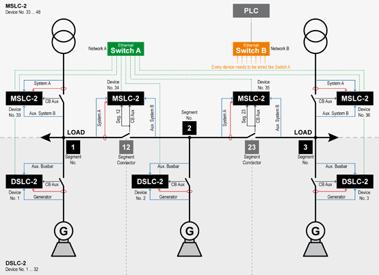 Woodward’s MSLC-2™ functions with the DSLC-2™ control to provide synchronization and load control across Utility and Intertie breakers. The MSLC-2/DSLC-2 combination operates over an Ethernet communication network to control simple or complex generator system applications. This combination, 32 DSLC-2’s and 16 MSLC-2’s, provide multiple unit, multiple segment, utility and intertie power management for complex power systems. Controls plant wide import/export levels while always providing bump-less load transfers with utility. The MSLC-2 control combines synchronization, dead bus closing, utility/intertie load sensor, baseload control, import/export control, VAR, power factor, and a master process control in one powerful package. The MSLC-2 provides phase matching or slip frequency synchronization, with voltage matching, across a utility or intertie breaker. The MSLC-2/DSLC-2 combination can handle multiple utility connections with a maximum of 8 bus segments in one application. The MSLC-2’s load sensor and load control sense true RMS power and provide a bump-less loading and unloading against a utility grid. Baseload, import/export, process, and utility unload modes control the KW power between different power sources at the same time controlling the reactive power, VAR and power factor. Reactive power is also ramped on and off for the smoothest load transactions between power grids. The MSLC-2 communicates via Ethernet, with redundant Ethernet now available, to control real and reactive loading against the utility by DSLC-2 equipped generators. The tie breaker mode allows synchronization between multiple generator systems. Segments are connected and power can be measured across an intertie, but no load control is functional when in Tie breaker operation.